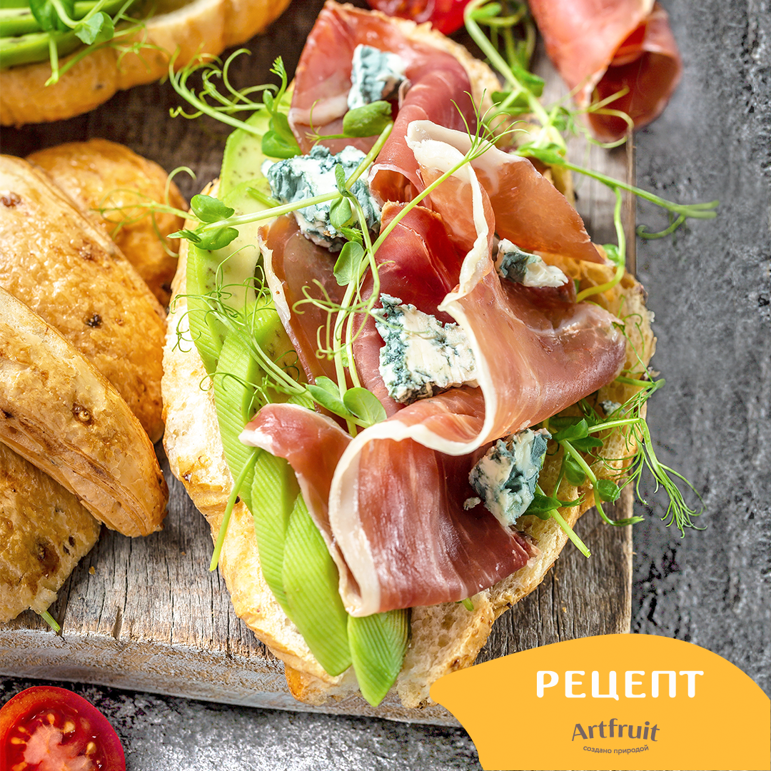 Ингредиенты: ✔️Авокадо Artfruit – 1 шт. ✔️Багет – ½ шт. ✔️Прошутто– по вкусу ✔️Сыр дорблю– 200 г. ✔️Оливковое масло – по вкусу ✔️Микрозеленьгороха/подсолнечника – по вкусу Способ приготовления: 1️⃣Багет разрезаем вдоль, делим половинки на две части. Подсушиваем в духовке до румяности, сбрызгиваем оливковым маслом 2️⃣Авокадо моем, чистим, освобождаем от косточки и нарезаем слайсами 3️⃣Собираем тост: на багет выкладываем авокадо, сверху прошуттои порубленный дорблю. Украшаем микрозеленью. Готово! Буон аппетито!
