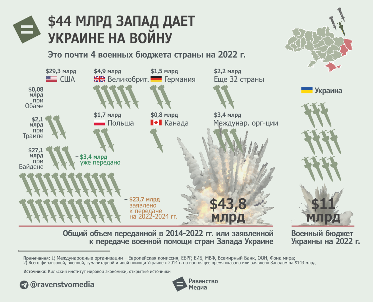 С 2014 г. со стороны стран Запада выделено или заявлено военной помощи уже на 4 военных бюджета Украины ($10,8 млрд в 2022 г.), подсчитало «Равенство».