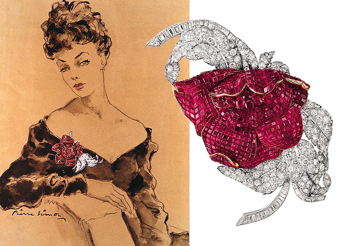 Крупные цветки состояли из небольших рубинов квадратной формы, плотно прижавшихся друг к другу. Эта техника была изобретена ювелирами компании и запатентована в 1933 году. Ее называли невидимой оправой, и приглядевшись к фото вы поймете почему. Между кристаллами нет полосок металла, благодаря чему создается невероятный эффект целостности поверхности лепестков. Цветок словно мягкой, сверкающей тканью, которая вот-вот начнет колыхаться на ветру. Эту технику можно встретить на многих других изделиях Van Cleef & Arpels, созданных по мотивам природы.
