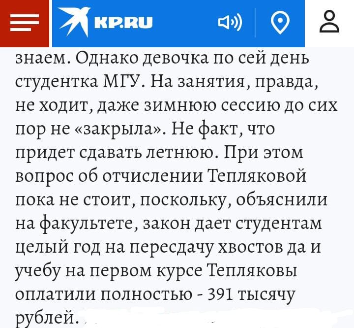 "Однако девочка по сей день студентка МГУ. На занятия, правда, не ходит, даже зимнюю сессию до сих пор не «закрыла». Не факт, что придёт сдавать летнюю. При этом вопрос об отчислении Тепляковой пока не стоит, поскольку, объяснили на факультете, закон даёт студентам целый год на пересдачу хвостов, да и учёбу на первом курсе Тепляковы оплатили полностью - 391 тысячу рублей".