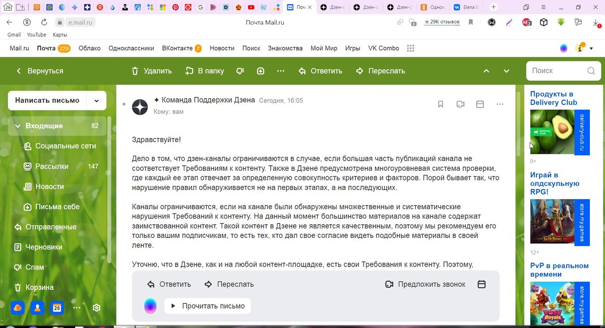 Сегодня после общения с одной подписчицей, в контенте канала которой преобладают видео и аудио-материалы, мы затронули такой вопрос, как ограничения показов канала, основные причины, и методы их решения. У нее канал еще не монетизирован, и с моментами блокировки Оля пока не сталкивалась, но на примере других "пострадавших" мы понимаем, что это "пока".... Опять таки, чтобы не гадать на "кофейной гуще", и не дожидаться "бана", я написала в службу поддержки с просьбой разъяснить все имеющиеся вопросы по данной теме.. Хотя бы потому, что у меня второй канал "музыкальный", где выкладываю я собственноручно смонтированные видосы, используя различные программы редактирования и конвертирования, но естественно, при этом заимствую либо фото с сайтов бесплатных фотографий, либо музыку, на которую не наложены авторские ограничения. Привожу скрины ответов службы поддержки. Таким образом, в двух публикациях у меня выявили нарушения, не вопрос конечно, удалю, им ведь нужен "уникальный" контент. Фото