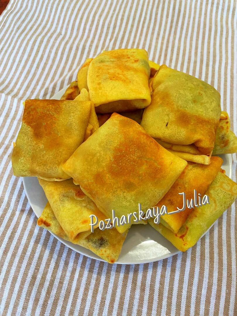 Блины на молоке, фаршированные куриными сердечками