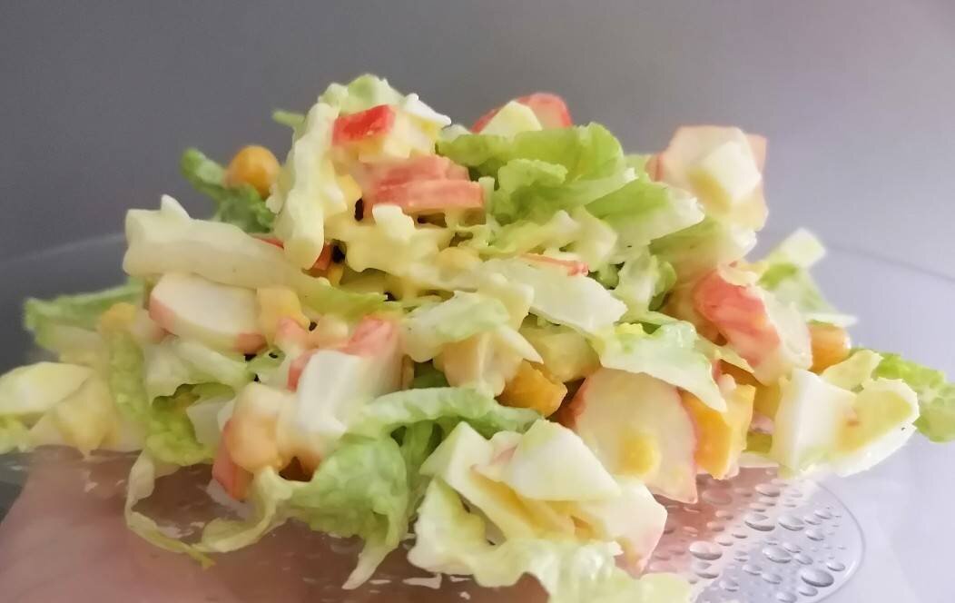 Очень вкусный салатик. Достаточно простой. Делаю его часто. Надеюсь и вам понравится). Всё ингредиенты по количеству режьте по вкусу. Если салатик понравится, буду рада вашим отзывам). Ингредиенты: яйца, крабовых палочек, пекинка, кукурузы, майонез , Если вам будет мало соли, можете добавить Способ приготовления: Режем пекинскую капусту. Крабовые палочки. Варёные яйца. Добавляем полбанки кукурузы. Добавляем майонез, по вкусу. Если нужно, добавьте соли. Я её никогда не добавляю. Майонез использую вот такой. Всё хорошо перемешиваем и салатик готов). Приятного аппетита.