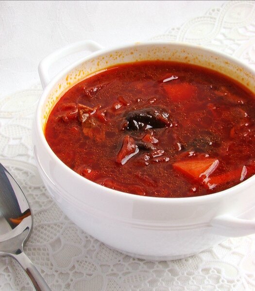 Ингредиенты Говядина - 500 г Картофель - 500 г Капуста белокочанная - 500 г Свекла - 300 г Морковь - 300 г Лук репчатый - 2 шт. Томат-паста - 2 ст. ложки Чернослив - 5 шт. Зелень петрушки - 1 пучок Соль - 0,5-1 ст. ложка (по вкусу) Масло растительное - 2 ст. ложки Вода - 2 л Сметана (для подачи) - по вкусу 1 шаг Подготавливаем все необходимые продукты. Если чернослив сухой, заливаем его кипятком на 10-15 минут. 2 шаг Мясо нарезаем небольшими кусочками. 3 шаг Выкладываем мясо в кастрюлю, заливаем холодной водой. Доводим до кипения, снимаем пену и варим мясо 1,5 часа на маленьком огне, под крышкой. 4 шаг Картофель очищаем и нарезаем крупными кусками. 5 шаг Свеклу очищаем, нарезаем соломкой. Обычно свёклу тушат в сковороде с добавлением лимонного сока или уксуса - можно сделать именно так. Но в этом рецепте свёкла добавляется в бульон в сыром виде и варится вместе с картошкой и капустой. 6 шаг Капусту шинкуем соломкой.Лук чистим и мелко нарезаем.Морковь чистим и натираем на крупной терке.