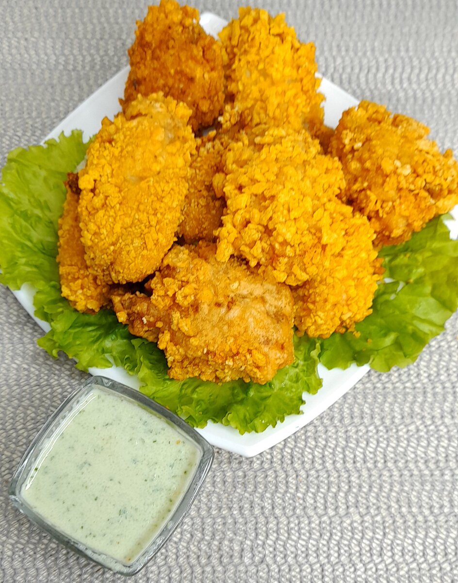 Надоели рецепты с куриным филе, ножками, и бёдрами? Давайте приготовим острые хрустящие и румяные крылышки с огуречным соусом. Несмотря на наличие небольшого количества мяса, куриные крылышки можно считать одной из самых вкуснейших частей курицы. Нежнейшая кожица, которой покрыты крылышки, при жарки превращается в аппетитную хрустящую корочку. Крылышки, приготовленные по моему рецепту, получаются очень вкусными, просто чудесными! Готовятся достаточно быстро и просто на сковороде. Главное: крылышки покупаем только охлаждёнными. Перемороженные уже теряют вкус и в них много жидкости. Для приготовления берём: На 4 - 5 порций: -крылья куриные-10 шт(850 гр) -мука -0,5 стакана -хлопья кукурузные (без сахара) -150 гр -перец молотый острый- 1/3 ч.л -чеснок 2-3 зубчика -уксус винный, яблочный- 2ст.л. -яйцо - 2 шт -соль - 1 ч.л. неполная -перец чёрный молотый- по вкусу ( 1/3 ч.л.) -масло растительное - 300-400 гр Соус острый: -йогурт натуральный - 150 гр -чеснок - 4 зубчика -огурец свежий -