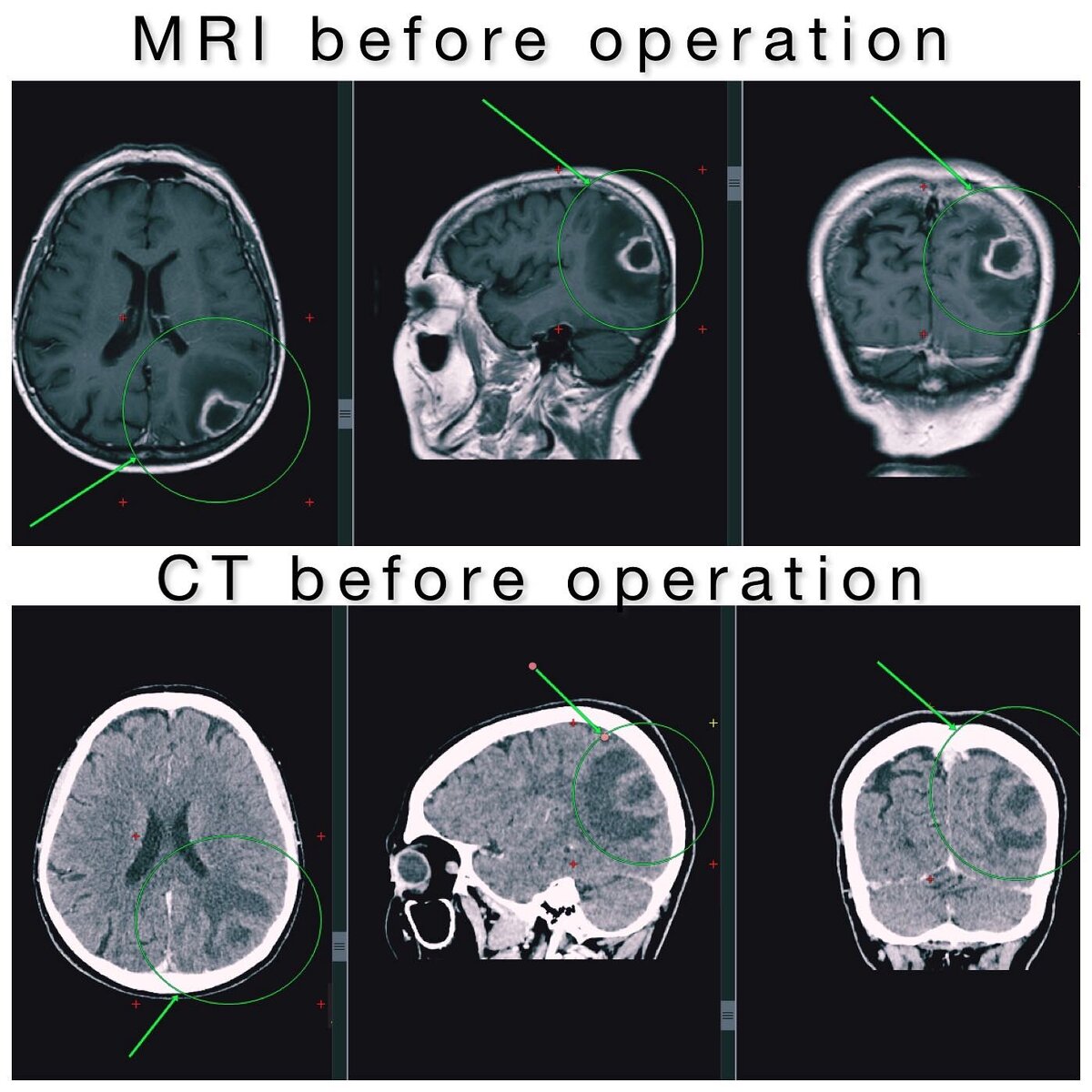 В настоящее время, объемные образования головного мозга довольно часто встречаются как среди молодого, так и старческого населения. Человек на протяжении длительного времени живет и не имеет никаких симптомов. Крайне редко, когда опухоль как-то себя проявляет. Проявления начинаются тогда, когда объемное образование достигает довольно больших размеров. На представленных изображениях, у пациента внезапно возникла амнестическая афазия (больной понимает речь, но не может вспомнить название некоторых предметов), после чего было выполнено МРТ головного мозга с контрастным усилением и консультация нейрохирурга. После предварительной медикаментозной и психологической подготовки было проведено оперативное вмешательство. Выполнена костно-пластическая трепанация черепа (это вид операции, целью которого является создание окна в черепе, с дальнейшим закрытием окна собственной костью, которая была выпилена в начале операции) с удалением объемного образования. Результат биопсии опухоли: гли