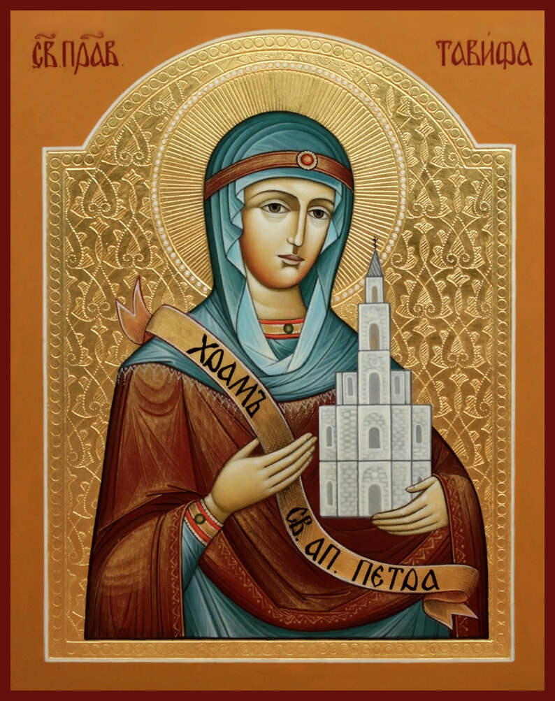 Святая праведная Тавифа Иоппийская. Дни памяти: Житие. Святая праведная Тавифа (I), женщина добродетельная и милосердная, принадлежала к христианской общине в Иоппии. Она творила много мтлостыни. Случилось так, что она тяжело заболела и умерла. В то время недалеко от Иоппии, в Лидде, проповедовал святой апостол Пётр. Его попросили придти. Когда апостол пришёл, вдови́цы стали показывать рубашки и платья, которые им сшила Тавифа. Преклонив колени, апостол помолился Господу, подошёл к одру и сказал: "Тавифа, встань!" Она поднялась совершенно здоровой (Деян. 9:36). Тропарь праведной Тавифе Иоппийской в Неделю о расслабленном, глас 4; Апо́столом сотаи́ннице, ми́лостивая Тави́фо,/ оби́тели же́нския нача́ло положи́ла еси́/ и бе́дным одея́ние была́ еси́,/ послу́шнице смире́нная,/ сло́ву апо́стола Петра́ повину́вшися,/ из ме́ртвых си́лою Христо́вою возста́ла еси́/ и ны́не на Небесе́х све́тло пра́зднуеши./ Те́мже моли́ Христа́ Бо́га// в