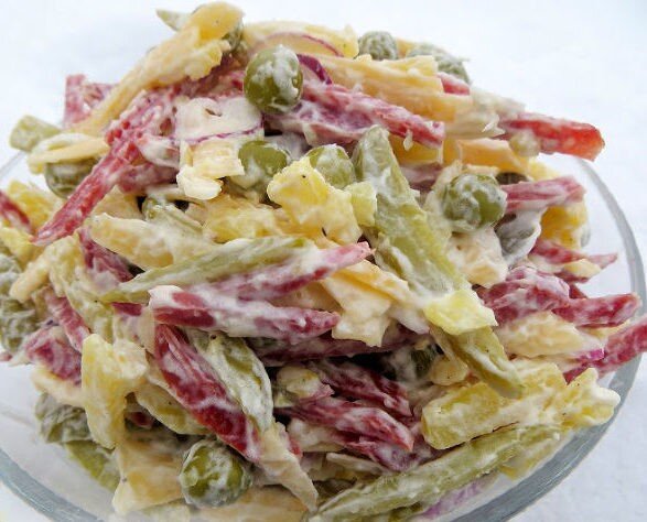 Ингредиенты Колбаса сырокопченая - 200 г Сыр твердый - 200 г Картофель отварной - 3 шт. Огурцы маринованные - 3-4 шт. Горошек зеленый консервированный - 1 банка Лук фиолетовый небольшой - 1 шт. Соль - по вкусу Перец черный молотый - по вкусу Майонез - 2 ст.л. (по вкусу) 1 шаг Подготавливаем продукты для салата с колбасой, сыром, огурцами, горошком и картофелем.Картофель заранее отвариваем, остужаем, очищаем. 2 шаг Колбасу нарезаем соломкой.Огурчики нарезаем соломкой.Отварной картофель тоже нарезаем соломкой.Лук нарезаем полукольцами или соломкой. 3 шаг Твердый сыр трем на терке. 4 шаг Смешиваем все нарезанные ингредиенты. Добавляем в салат с сыром, колбасой, картофелем и огурцами консервированный горошек, молотый черный перец и майонез. Все перемешиваем. 5 шаг Салат "Охотничий" с копченой колбасой готов. Приятного аппетита! #салаты рецепты #салаты и закуски #салат на праздничный стол