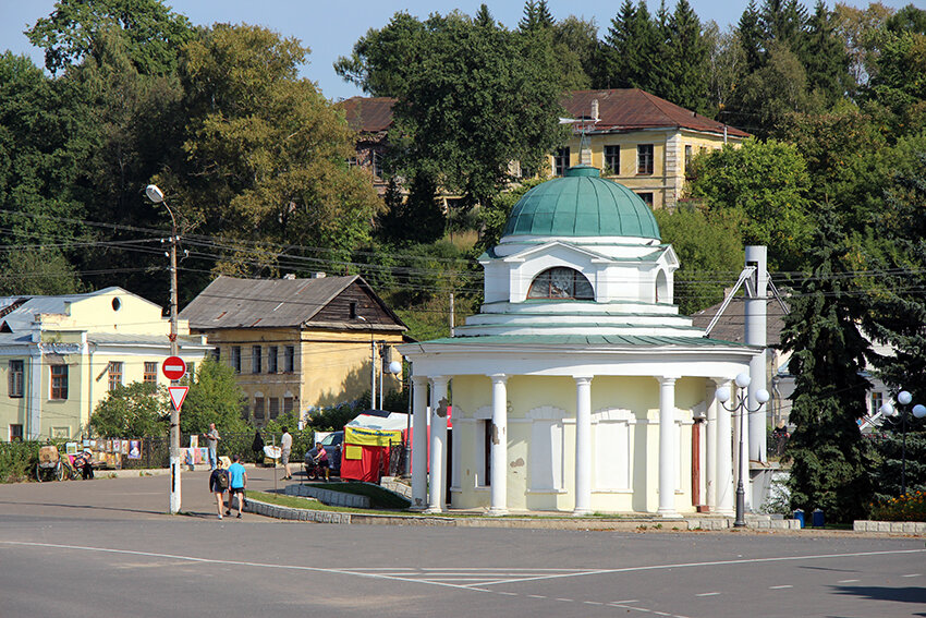 В прошлой своей публикации я рассказывала о нашей прогулке по левому берегу Тверцы в городе Торжок. В этой статье мы продолжим знакомиться с городом - прогуляемся по другому берегу, посмотрим на основные достопримечательности. Оказавшись на другом берегу реки, первым делом обращаем внимание на Крестовоздвиженскую часовню. Рядом бюст ее создателя - архитектора Львова. Кстати, надо отдать должное, это место довольно-таки ухоженное и красивое. Все же есть в Торжке такие вкрапления благоустройства. Старинное здание магистрата тоже выглядит вполне неплохо. Не от того ли, что сегодня в ее стенах размещается районная администрация и ЗАГС? А за соседним невысоким домиком виднеется изящная колокольня Климентовской церкви. Но к ней мы не пойдем, а пойдем в сквер, носящий имя Кирова. Непонятно, какое отношение он имеет к городу, но сквер в его часть назвали, да и памятник поставили. Сквер, кстати, неплохой. Но пустующий. Мало кого мы встретили по пути. В центре сквера возвышается помпезное здан
