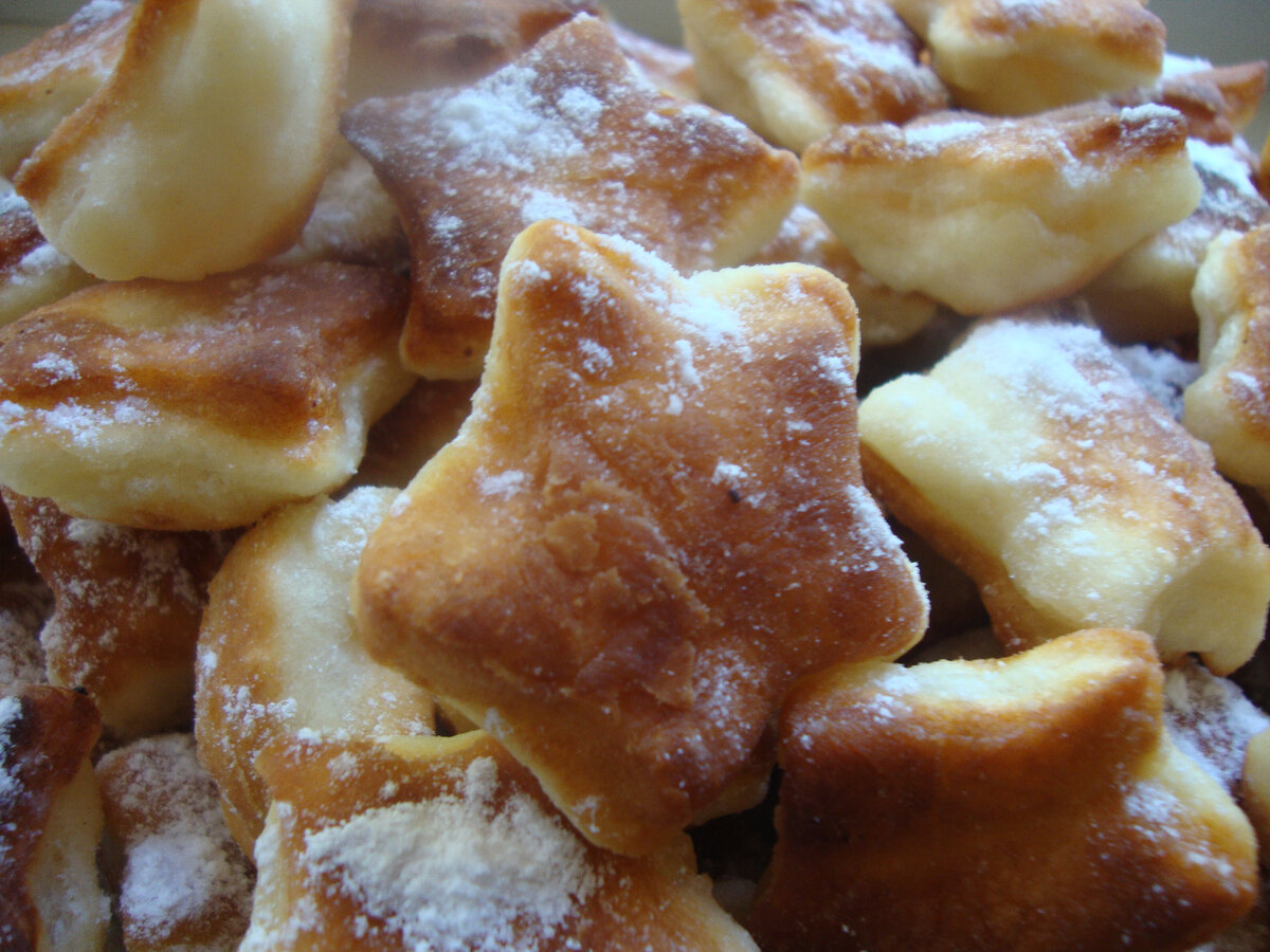 200г-творога,1 яйцо, соль щепотка,1ст/муки(0,5+...),2,5 ст/л сахара, 50г -растительного масла, ванилин немного ,но не пакет, сода-щепотка. Готовим: Яйцо растереть сахаром+ соль+масло. Просеянную муку+ в яичную смесь +добавить творог 5% лучше,чем 0% и замесить ложкой,затем руками ,чтобы оно было не жидкое ,но и негустое(главное чтобы не липло к рукам+муку постепенно для того Чтобы формочкой любой (в моем случае звездочка) приготовить печенье. Затем разогреть сковороду(с глубоким бортом)+масла меньше половины+ печенье,убавить огонь ,накрыть стеклянной крышкой,чтобы видеть процесс приготовления. Как только печенье поднимется,перевернуть ножом или вилкой каждое,закрыть крышкой. Приготовить бумажное полотенце и выложить ,при остывании посыпать сахарной пудрой. Получаются воздушные,вкусные и красивые. Попробуйте приготовить. Я думаю ВАМ понравится. Подписывайтесь на мой канал я всегда буду рада пообщаться!