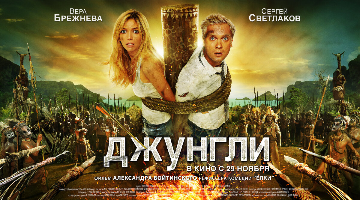 В семье Сергея и Марины наступил кризис. Сергей постоянно с головой в работе, своей жене уделяет всё меньше и меньше внимания. Даже на годовщину умудрился опоздать. Во время одной из ссор пара решает отправиться отдыхать на острова. Экзотические. Но попав на них, вместо отдыха они продолжают выяснять отношения. Сергей по-прежнему ищет вариант вернуться к работе, а Марина старается понять, есть ли смысл продолжать жить вместе. А тут ещё и дикие племена на острове решили поймать их обоих... Эх, солнце, пляж, песочек. Как же всего этого не хватает сейчас. Понятно, что от фильма «Джунгли» не стоит ожидать высокоинтеллектуального зрелища. Приставка 3D недвусмысленно намекала на возможность полюбоваться красотами райского уголка, куда попали главные герои. Красиво, что и говорить. Фанаты Брежневой могут насладиться красотой тела актрисы, благо она не торопиться обнажаться. К счастью и Светлаков тоже. «Джунгли» сочетают в себе смешную историю и рассуждения создателей на тему отношений женатых
