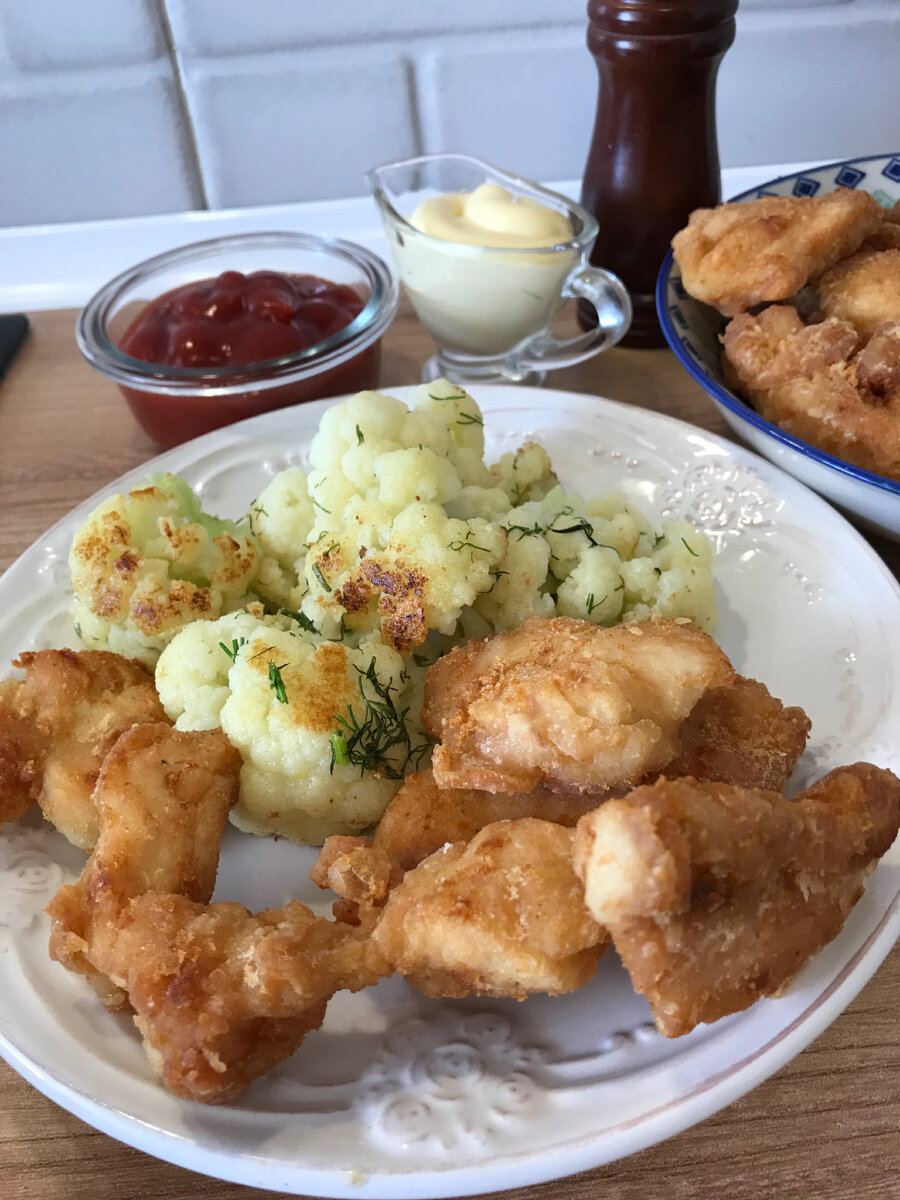 Нам очень нравится есть все жареное, перченое, запечённое. А потом мучаемся от изжоги. Для того чтобы смягчить болезненное воздействие вредной еды, предлагаю приготовить гарнир из цветной капусты. Этот гарнир прекрасно подходит к наггетсам из моей предыдущей публикации. Нам понадобится: Берём головку цветной капусты. Очищаем ее от листьев, обрезаем плодоножку, моем. Опускаем в кипящую, подсоленную воду. Пусть она варится не более 7 минут. Для того чтобы она была красивой и не разваливалась. Достаем, остужаем. На сковороде растапливаем 100 грамм сливочного масла. Разрезаем наш немного остывший качанчик на соцветия. Отправляем их на сковороду, в хорошо прогретое масло. Обжариваем нашу капусту только со стороны цветков. Быстро, на сильном огне. Нарезаем зелень, мелко рубим чеснок и отправляем к капусте. Огонь в это время отключаем. Вот и всё. Гарнир готов. Заняло приготовление буквально 15 минут. Не надо меня закидывать тапками, и ругать , что это всё равно жареное и вредное.