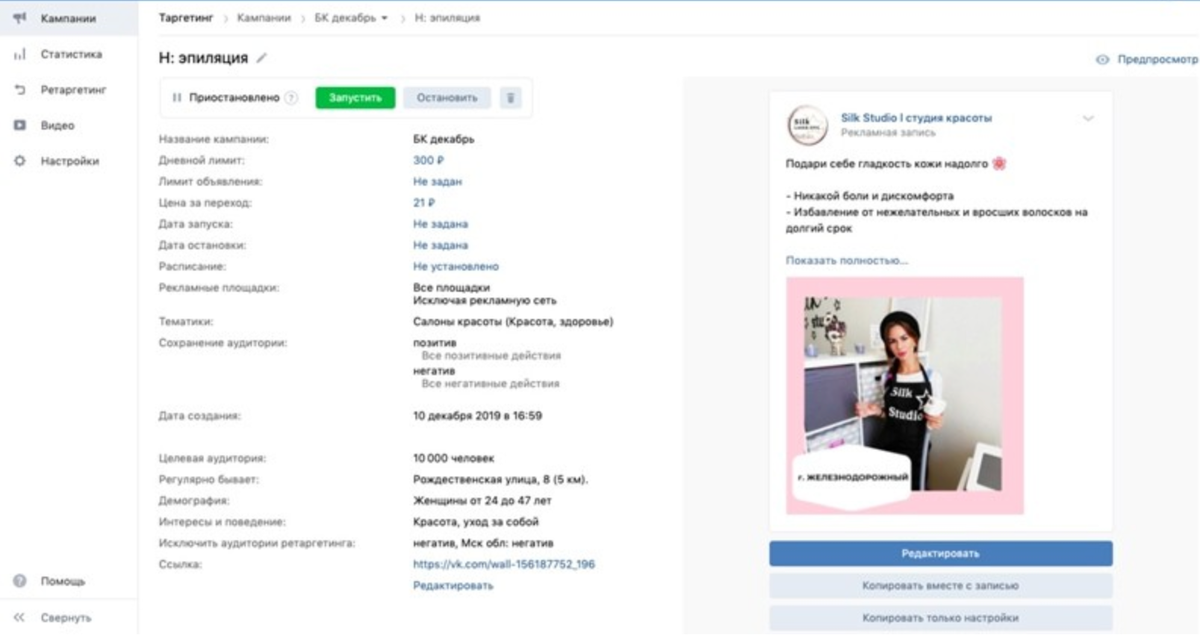 Клиент после проведения рекламной компании остался доволен. Бюджет ВК: 20 000 ₽.