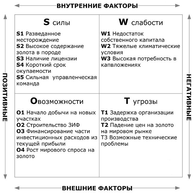 Пример SWOT-анализа в бизнес-плане золотодобывающего предприятия