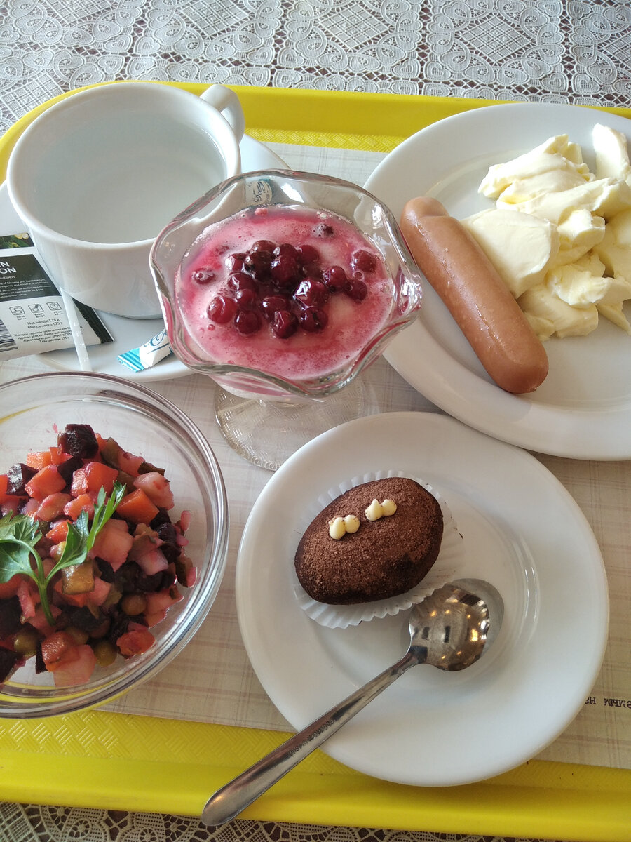 Рубрика "Что я ем". Когда бываю в Москве, встаёт вопрос, где перекусить? Одно из любимых мест- " Столовая 57" в ГУМе. Этот раз, будучи в Москве, я жила на Никольской улице, т.е. в самом центре, поэтому завтракала именно там. В десять утра в ГУМе почти никого нет и очень уютно. По ценам тоже приемлемо. За первый набор блюд я заплатила 530 рублей, за второй- 460. Особенно вкусный нежнейший омлет и мусс клюквенный (напомнил детство)