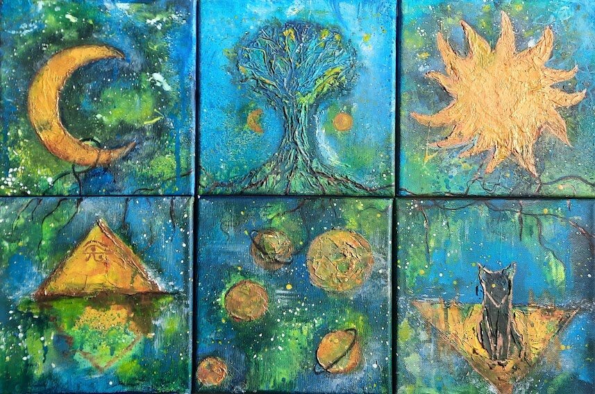 Меня зовут Виктория Гумарова. Я художник. Сегодня я хочу рассказать, как у меня родилась идея создать серию картин «Сотворение мира» и что я вкладывала за смысл в эти картины. Серия эта родилась, когда я посмотрела ряд документальных, научных фильмов-передач и познакомилась с термином: «палеоконтакт». Это гипотеза, которая предполагает, что инопланетяне в прошлом посещали Землю и вступали в контакт с людьми. Предполагается так же, что они построили или помогли людям построить мегалитические сооружения. Такие, как древние Египетские пирамиды. Меня очень впечатлила эта информация. Я конечно знаю, что эту теорию считают псевдонаучной. Но для художника это пища для размышлений. В голове моей варились образы, которые вылились в 6 картин, написанных в экспериментальной для меня смешанной технике. Картины писала акрилом и использовала для объема текстурную пасту. 6 образов: луна, солнце, космическое древо, планеты, египетская пирамида и египетское священное животное кошка. Все части картины