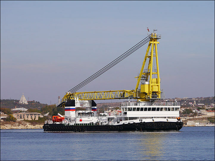 Помните, когда мы разбирали фейк с поражением фрегата "Адмирал Макаров", я привёл фразу из британского журнала UKDJ: Служба слежения за морскими судами показала российский спасательный корабль, идентифицированный как SPK-46150, на пути к месту происшествия. Этот "спасательный корабль" не что иное, как плавучий кран, вот этот: Как он мог спасать фрегат - понятно только англичанам, но вот теперь стало известно, где он находится: Это ставший уже узнаваемым причал на острове Змеиный. Что мы тут видим? Плавкран, перед ним просвечивает сквозь воду лежащий на дне десантный катер типа "Серна" Д-144. Хорошо просматривается стоящий в его трюме ЗРК "Тор". Понятно, что кран пришёл поднять этот "Тор" и вполне возможно, поучаствовать в подъёме и "Серны". Украинские комментаторы радостно писали, "що у Змеиного потоплен единственный катер этого проекта на ЧФ". Если бы они были не столь непрофессиональны или попросту не столь ленивы, то легко бы из того же Интернета узнали, что на ЧФ два таких катера и
