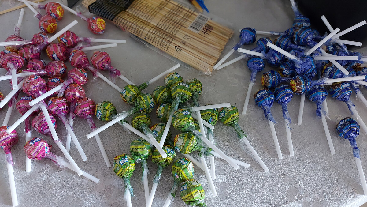 Для букета нам понадобятся: чупа-чупсы, шпажки, скотч, бумага для букетов, ленточка, бантик. Надеваем чупа-чупсы на шпажки, фиксируем скотчем. Собираем букет - шпажка к шпажке и фиксируем скотчем. Можно собирать в хаотическом цвете, а можно собрать по цветовой гамме - круг жёлтый, круг красный, круг синий и т.д. Берём бумагу для букетов и оформляем букет. Фиксируем скотчем, степлером. Завязываем ленточку, можно прикрепить бантик. Наш букетик готов!
