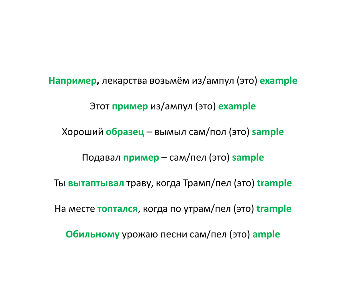 Как правило, запоминая любую информацию или сложное слово на своем родном языке, мы с чем-нибудь ассоциируем. При запоминании английского слова у нас тоже рождается ассоциация. Только она уже напрямую завязана на похожее по звучанию русское слово. Конечно, можно и просто зубрить по карточкам и стикерам. Или пытаться запомнить целыми предложениями. Выбор за человеком. Наш вариант запоминания подойдет больше новичкам. Рассмотрим группу слов, заканчивающихся словом «ample». Такие группы принято называть Word Family. example [ɪgʹzɑ:mp(ə)l] — пример, образец, экземпляр, урок, служить примером sample [ʹsɑ:mp(ə)l] – образец, выборка, проба, пример, образчик, пробовать, брать пробу trample [tramp(ə)l] – топтать, попирать, растоптать, попрание, топанье, топтание ample [ʹamp(ə)l] – достаточный, просторный, обширный, обильный, пространный, подробный Мы запоминали с помощью такой мнемотехники. Ведь понятно же, что ample [ʹamp(ə)l] — это кто-то там пел. И вот наши запоминалки. И мнемотехника