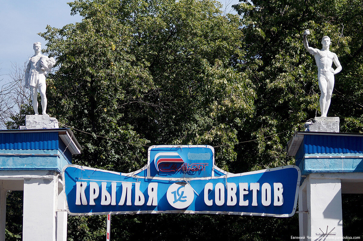 На фото внизу: энтузиастов приветствует фигура рабочего, созданная скульптором Г.Неродой и установленная здесь в 1970 году. Спецовка пролетария напоминает то ли костюм водолаза, то ли скафандр космонавта. По городской легенде, это один из конкурсных проектов памятника Юрию Гагарину – работа лауреата воцарилась на высоченной стеле на Ленинском проспекте, а невостребованным произведениям нашлось место в других районах города.