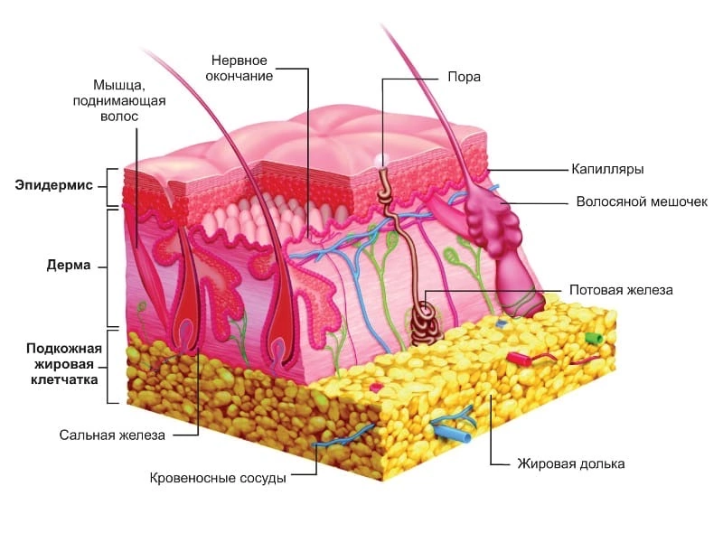Как я уже говорила ранее, кожный покров – самый крупный орган тела человека. Состоит кожа из трёх слоёв: Эпидермис - верхний, самый тонкий слой кожи, доступный взгляду. Толщина его всего 0,1 мм. 5 слоёв эпидермиса: 1. Базальный слой – самый нижний. Деление одного ряда клеток этого слоя образует верхние слои эпидермиса. В базальном слое расположены клетки, вырабатывающие пигмент меланин, количество которого определяет цвет кожи. 2. Шиповатый слой. Состоит из 5–15 рядов клеток, соединённых отростками, между которыми циркулирует жидкость, питающая эпидермис. 3. Зернистый слой. Один - два ряда клеток этого слоя содержат зёрна кератогиалина (белкового вещества, образующего кератин – роговое вещество кожи). 4. Блестящий слой. Один - два ряда клеток, содержащих промежуточный продукт преобразования кератогиалина в кератин. 5. Роговой слой. Самый верхний слой эпидермиса. Состоит из ороговевших клеток и отличается относительной стойкостью к внешним воздействиям. Эпидермис – слой, пос
