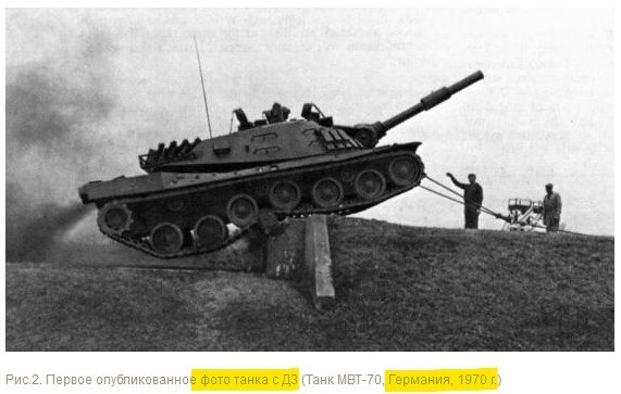 На самом деле — нет. Неоднократно сталкивался с тем, что опытному американо-немецкому танку MBT70 приписывается установка динамической защиты (ДЗ). Вот и в заметке Дорохова Н. С., начальника отдела активной защиты НИИ Стали, присутствует фото MBT70 с занятной подписью к ней [1]: Начнём с того, что ДЗ на танки MBT70 не устанавливалась и не планировалась. На фото представлен второй опытный образец американского варианта танка с грузами на башне для повышения массы машины до проектной [2, с. 139]. Кроме того, Ханникат указывает, что это съемка на Абердинском полигоне (США), датируемая 27 марта 1969 года. Кроме этой распространённой ошибки в статье приведена расхожая байка о создании ДЗ «Контакт-1», не имеющая ничего общего с действительностью: Ближневосточный конфликт и демонстрация реальных возможностей ДЗ «Блэйзер» стали своего рода катализатором работ по ДЗ в России. В июне 1982 года Министерством обороны ставится ОКР «Контакт-1» по разработке ДЗ для танков Т-80; Т-72Б; Т-64А; Т-62 и