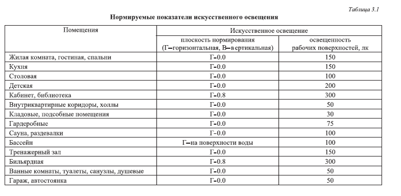 Нормы освещенности выбираются на основании СНиП 23-05–95 «Естественное и искусственное освещение. Нормы проектирования», СП31-110–2003, МГСН 2.06–99. Выдержки из МГСН 2.06–99 приведены в табл. 3.1.