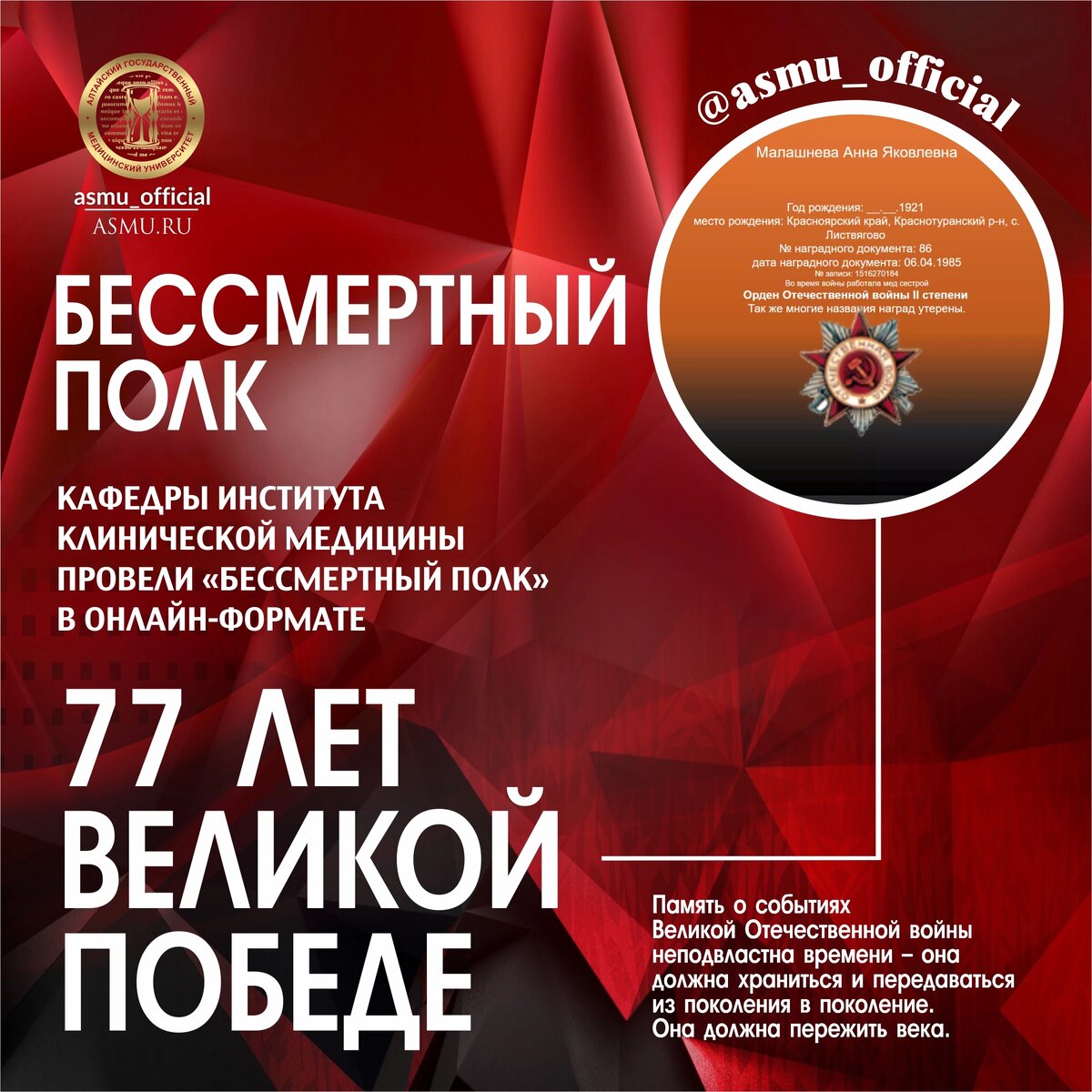 77 лет Великой Победе: кафедры Института клинической медицины провели "Бессмертный полк-онлайн"