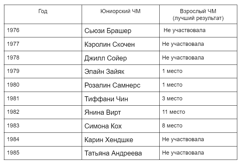 За основу возьмём результаты фигуристок выигравших юниорский чемпионат мира и проследим за их дальнейшими успехами на взрослых турнирах.
