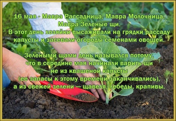 16 мая в народе называли «Мавра-рассадница». Можно было высаживать рассаду капусты. Приметы на 16 мая: - Если с утра ясно и солнечно, то и начало лета будет солнечным; - Пышно цветёт черемуха - лето будет дождливым; - На дубе уже появлись листья, а на ясене пока нет, будет засуха летом; - С утра роса обильная - огурцов будет много; - Запел соловей - больше заморозков не жди.