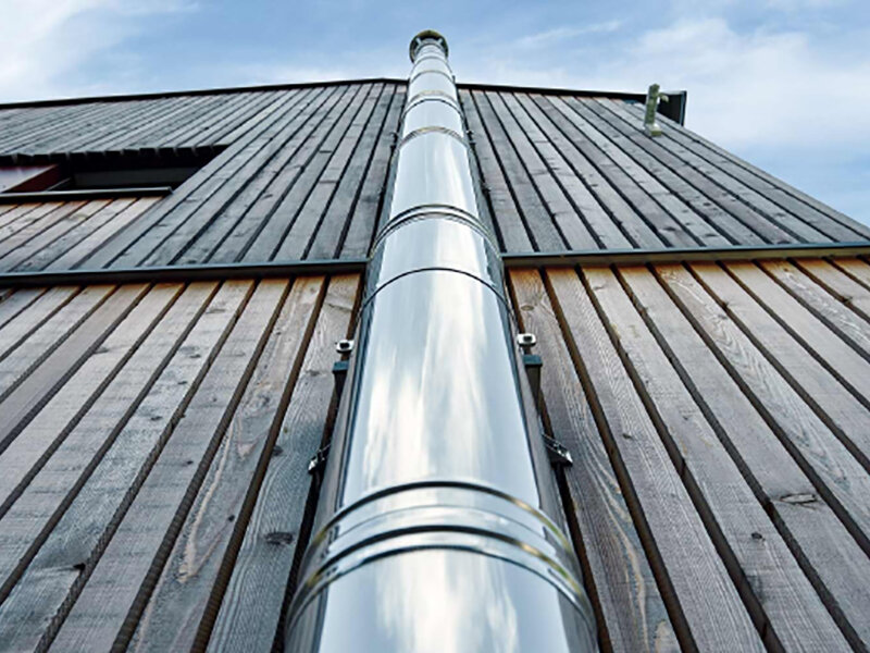 В некоторых помещениях установка камина с внутренним дымоходом либо вообще невозможна, либо требует слишком трудоёмких операций. В этом случае оптимальное решение – вывод дымовыводящей трубы на фасад. Однако, такая конструкция требует дополнительной тепло и гидроизоляции. При этом следует учитывать материал стены, который должен быть максимально огнестойким. И хотя, как правило, температура стального дымохода редко превышает +100°С, если речь идёт о деревянных постройках или домах с внешним утеплителем, риски возгорания всё-таки существуют. Не стоит также забывать о повышенном износе такого дымохода, который будет противостоять всем климатическим факторам.