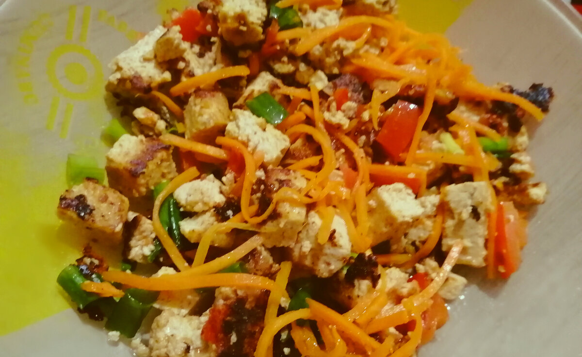 Сытная закуска, которую можно быстро и легко сделать, пригодится в любой ситуации. Тофу с овощами — универсальный рецепт для праздника, романтического свидания, встречи с гостями или обычного ужина. Блюдо практически невозможно испортить, потому что оно не содержит сложных ингредиентов. Список необходимых продуктов Тофу с овощами понравится экономным хозяйкам, которые хотят порадовать близких без особых затрат денежных средств. Закуска идеально подходит вегетарианцам и тем, кто временно соблюдает пост. Блюдо может внести разнообразие в привычный рацион человека. Тофу часто используется в качестве альтернативы продуктам животного происхождения, поскольку по вкусу такой сыр напоминает мясо. Ингредиенты, которые понадобятся для закуски: • морковь по-корейски (160 г); • один красный перец среднего размера; • зеленый лук (по вкусу); • один большой помидор или два средних; • натуральный тофу (200 г); • растительное масло (1 ст. л.); • соль (по вкусу). Количество продуктов рассчитано н