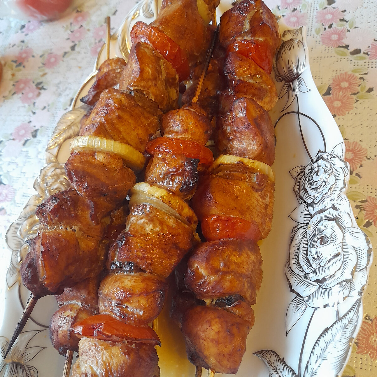 Хочется шашлычка? А на улице непогода или нет возможности выехать на природу? Не беда. Приготовим шашлык дома. Многие говорят, что куриная грудка сухая и безвкусная. Сегодня опровергнем это мнение. У нас с Вами получится сочная, нежная и ароматная. Нам понадобятся: Куриная грудка – 1 кг.; Соевый соус – 100 гр.; Паприка копченая – 1 ст. л.; Сало – 50 гр.; Деревянные шпажки – 6 шт.; Помидор – 2 шт. (средние); Репчатый лук – 1 шт.; Фольга – по длине формы для запекания. Розмарин – 2 веточки; Соль, перец по вкусу Соус: Огурец свежий – 1 шт. (250 гр.); Сметана густая – 2 ст. л.; Майонез – 2 ст. л.; Чеснок – 3 зуб.; Зелень петрушки и укропа – по 30 гр.; Масло оливковое – 1 ст. л.; Сок лимона – 1 ч.л.; Соль, черный перец по вкусу. На выходе 400 мл. соуса. Если для вашей семьи это многовато, уменьшите составляющие вдвое, например. Маринуем шашлык: Филе курицы обмыть, просушить, порезать на кусочки размером 3,5 * 3,5 см. Перемешать в глубокой миске с копченой паприкой, добавить соевый соус. Не