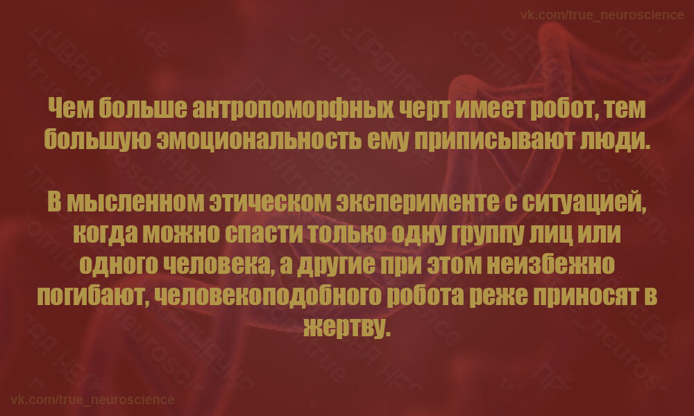 Черты человекоподобия у робота определяют то, в какой степени люди приписывают ему эмоциональность. Из результатов мысленного этического эксперимента выходит, что робота с наибольшим числом антропоморфных черт реже приносят в жертву в ситуации, когда можно спасти или группу людей, или только одного человека (при том, что остальные неизбежно погибают). Источники:
