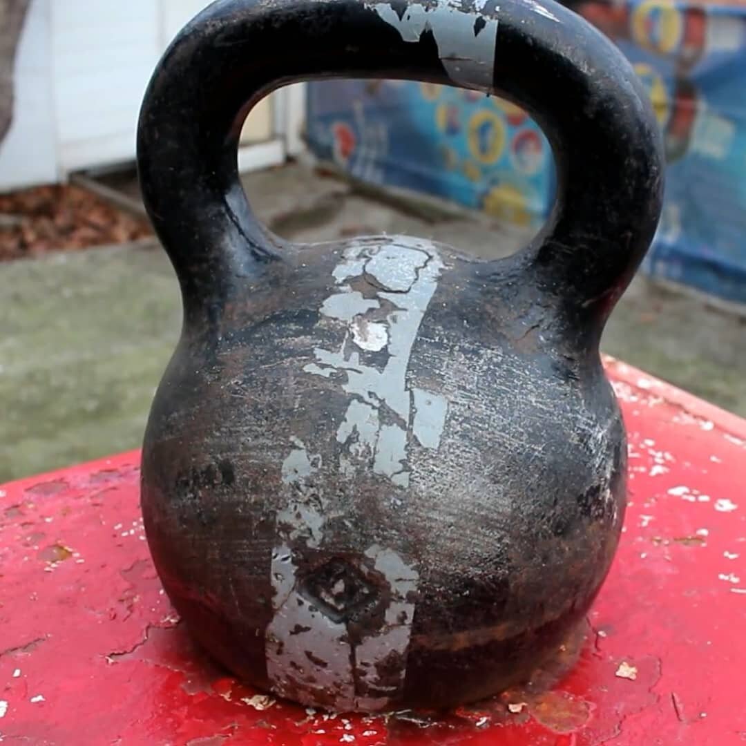 ну и слишком красивой гиря быть не должна, ведь, если она постоянно в таком состоянии - значит вы с ней не работаете. второе фото - это сразу после высыхания краски. в настоящее время вид этой гири вновь стремится к первому фото, потомучто я ее сильно эксплуатирую: эмаль местами откололась, а дужка стерается. кстати среди моих видео есть процесс реставрации гири своими руками, без электроэнструмента.