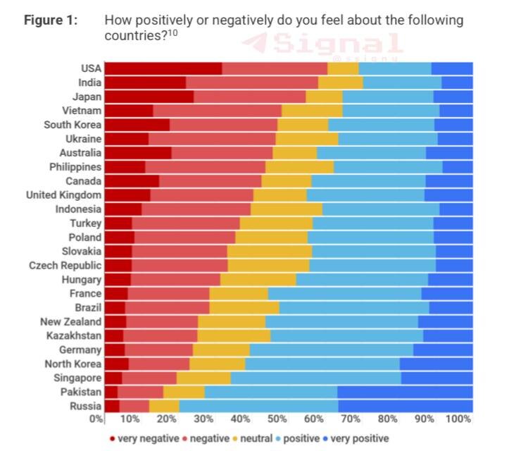 «Согласно исследованию CEIAS, населения Китая относится к России лучше всего в мире. Графики: 1) Как вы относитесь к следующим странам? Больше 80% относятся к России позитивно и крайне позитивно. 2) Как изменилось ваше отношение к России за последние 3 года? 78% отмечают, что улучшилось. 3) Как изменилось ваше отношение к США за последние 3 года? 69% отмечают, что ухудшилось. 4) Как изменилось ваше отношение к Японии за последние 3 года? 36% отмечают, что ухудшилось. 5) Как вы оцениваете внешнюю политику приведённых стран? Около 80% оценивают внешнюю политику Китая от нейтрально-позитивно до очень позитивно. В отношении внешней политики РФ такое же отношение в 70% случае. 6) Как относятся к Китаю в приведённых странах? Около 80% китайцев считает, что в России к Китаю относятся лучше, нежели в других странах. 7) С США главное слово-ассоциация — гегемон 8) С Россией главное слово-ассоциация — нация воин».