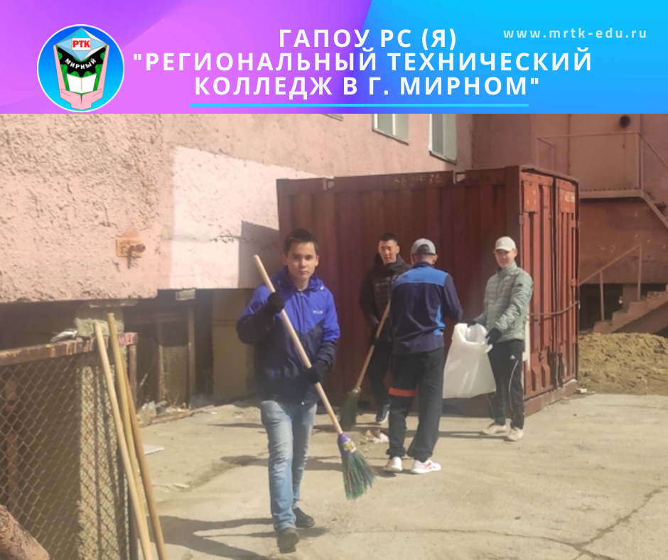 Студенты МРТК приняли активное участие в субботнике общежития головного учреждения. Видео. 16 мая 2022 г. в рамках Месячника по санитарной очистке, благоустройству и озеленению территории в общежитии ГАПОУ РС (Я) «Региональный технический колледж в г. Мирном» проведен субботник. Студенты проявили активную гражданскую позицию и навели порядок на прилегающей территории общежития. В ходе субботника территория общежития была очищена от прошлогодней травы, сухих листьев и мусора. Всего в уборке территории приняли участие 20 человек. Территория общежития заметно преобразилась, студенты внесли неоспоримый вклад в чистоту города Мирный! Юлия Левчук, специалист ОТ, ТБ и ПБ ГАПОУ РС (Я) «МРТК». Пресс-служба ГАПОУ РС (Я) «Региональный технический колледж в г. Мирном». #МРТК #Мирнинскийколледж #РегиональныйтехническийколледжвМирном #СПО #Якутия #Мирнинскийрайон #Алмазныйкрай #Мирный #месячникчистоты #субботник Ссылки по теме: