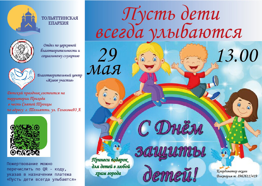 Отдел по церковной благотворительности и социальному служению Тольяттинской епархии совместно с Комплексным благотворительным центром социальной поддержки населения Самарской области «Живое участие» приглашают к участию в благотворительной акции «Пусть дети всегда улыбаются!» с целью оказания внимания, помощи и поддержки детям из многодетных и неполных семей, проживающих в городах Тольятти, Жигулевске и сёлах Ставропольского района.