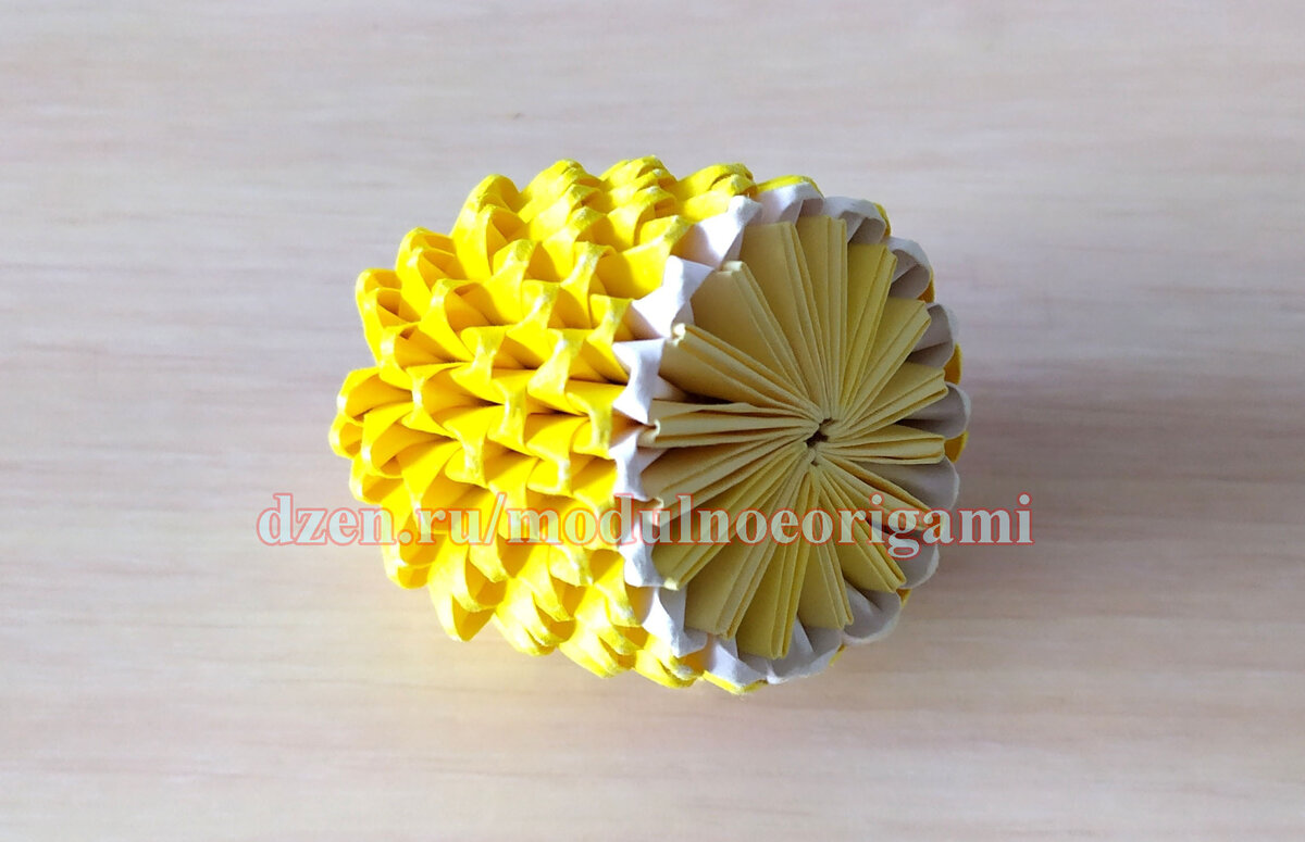 Здравствуйте, Друзья! На прошлом занятии мы с вами научились делать треугольные модули для оригами, собрали рыбку Скалярию, бабочку. Сегодня, как я и обещал, перейдем к объемным оригами. Давайте попробуем собрать ЛИМОН. Список мастер классов. Для изготовления лимона нам понадобится 152 модуля: 120 ярко-желтых, 16 белых и 16 светло-желтых. Если нет таких цветов, не беда, можно придумать свои. Первый ряд будет состоять из 16 светло-желтых модулей, второй из 16 белых, третий из 16 ярко-желтых. Для удобства, чтобы ряды не распадались, параллельно собираем третий ряд. Собрав змейку из 16 светло-желтых модулей, замыкаем ее в кольцо и фиксируем белым модулем, затем двумя ярко-желтыми. Аккуратно приподнимаем оригами и начинаем сдвигать внешние уголки вниз к центру. Должно получится вот так: Дальше делаем еще 6 рядов по 16 ярко-желтых модулей в каждом. Модули при этом сжимаем в кольцо, с каждым рядом стараясь его уменьшить. Формируем заключительный ряд, модули крепим через 2 уголка (8 модулей в
