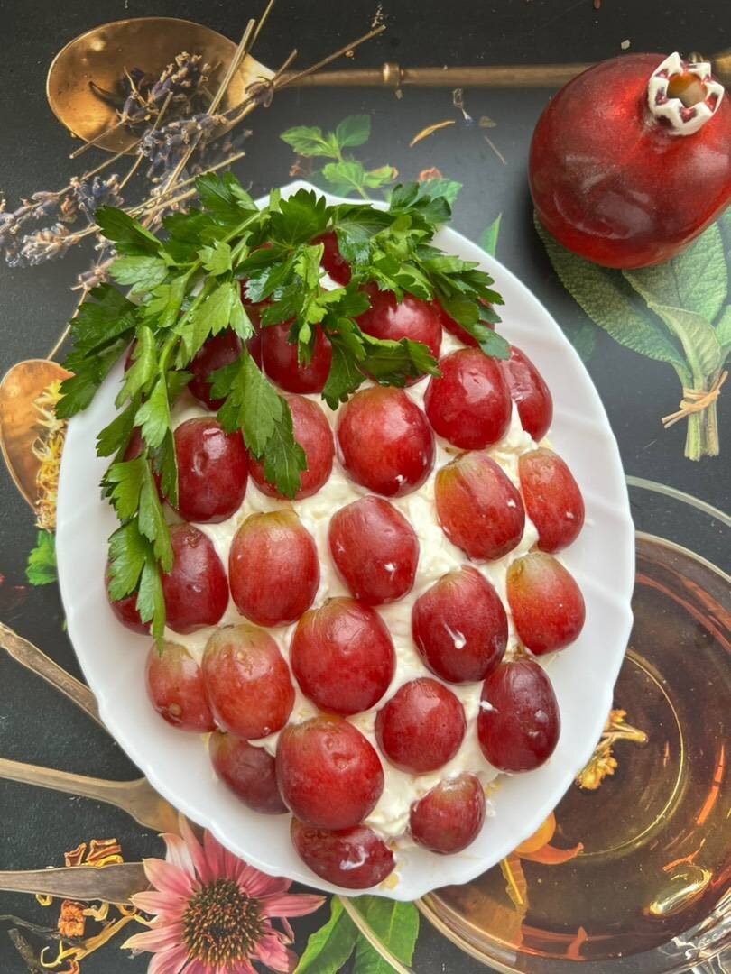 Очень вкусный салат! Конечно, можно взять и отварное филе, но с копчёной курицей в сочетании с виноградом - это просто 🔥 Ингредиенты: винограда, копчёной курицы, грецких орехов, яйца, сыра, Майонез, Петрушка Способ приготовления: Курицу разобрать и нарезать мелко. Вареные яйца и сыр - натереть на тёрке. Грецкие орехи подсушить на сковороде и порубить ножом. Берем блюдо и выкладываем слой из курицы,формируя форму виноградной грозди- хотя форма может быть произвольная. наносим сеточку из майонеза, разравниваем, посыпаем орехами, сверху сыр и снова слой майонеза. Виноград разрезаем пополам (если надо- удаляем косточки) и украшаем наш салат. Сверху выкладываем веточек петрушки. Убираем в холодильник на пару часов для пропитки. Приятного аппетита