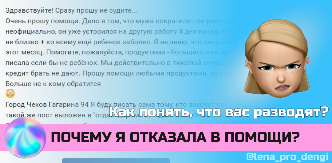 Хотела сегодня на другую тему поговорить, но такой интересный повод нарисовался ) Просят продукты в соцсетях — в чем развод? В группе ВК предложила новость девушка. Пишет, что сложности с финансами, просит помочь продуктами, игрушками для ребенка. Текст сообщения: Здравствуйте! Сразу прошу не судите…Очень прошу помощи. Дело в том, что мужа сократили — он работал неофициально, он уже устроился на другую работу 4 дня назад, но зарплата еще не близко + ко всему ещё ребенок заболел. Я не знаю, что делать и как протянуть этот месяц. Помогите, пожалуйста, продуктами — большего я не прошу. И я бы не писала если бы не ребёнок. Мы действительно в тяжёлой ситуации, пробовала кредит брать не дают. Прошу помщи любыми продуктами. не проходите мимо. Больше не к кому обратится Город Чехов Гагарина 94 Я буду писать сама тому, кто захочет помочь. Просто такой же пост выложен в «отдам даром там одни оскорбления и в личку, и . Очень нуждаемся в любых продуктах… и если кому не жалко детские и