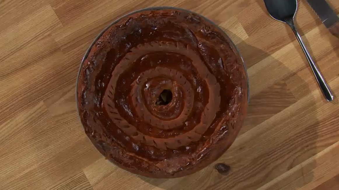 8. Часть теста оставляем для декора, делаем небольшие жгутики и оформляем по собственному усмотрению. Перемешиваем яйцо, смазываем им пирог, но элементы декора не смазываем. В центре пирога делаем отверстие. Ставим пирог в духовку, разогретую до 170 градусов, на 20-30 минут.