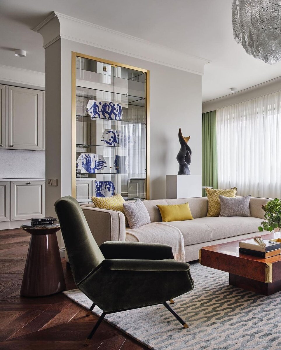 “Уникальная винтажная мебель, предметы искусства и выразительные акценты — все это сочетается в двухуровневой квартире на Юго-Западе Москвы, которую оформляли для дружной активной семьи дизайнер Оксана Короткина и архитектор Владимир Данилин” Прекрасное сочетание песочного-серого, оттенков малахита, лайма, оттенков белого и насыщенного синего цвета. Проект опубликован в журнале Elle Decoration. Реализовано салоном Giulia Novars (giulianovars_nahimovskiy). #дизайн #интерьер #кухня #мебель #винтаж #ижевск