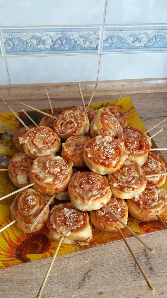 #можновсё #люблюготовить #домавкуснее #пицца Ингредиенты: слоеного теста, колбасы, сыра, кетчупа, майонеза, кунжут для посыпки, яйцо, молока Способ приготовления: Тесто раскатываем в прямоугольник, смазываем кетчупом и майонезом. На крупной терке натираем колбасу и сыр. Сворачиваем в рулет, край пришипываем. Разрезаем на кусочки примерно 1,5 см, каждый кусочек протыкаем шпажкой и укладываем на противень застеленный пергаментом. Яйцо и молоко смешиваем и обмазываем сверху каждый кусочек.Посыпаем кунжутом. Отправляем в духовку при t 180° на 20-23 минуты.