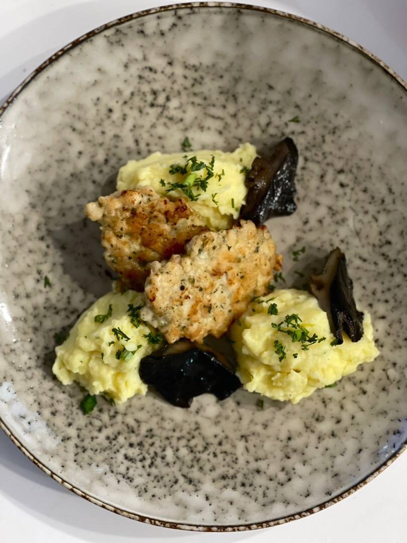 Картофельное пюре на сливках с нежными куриными оладьями и чёрными груздями