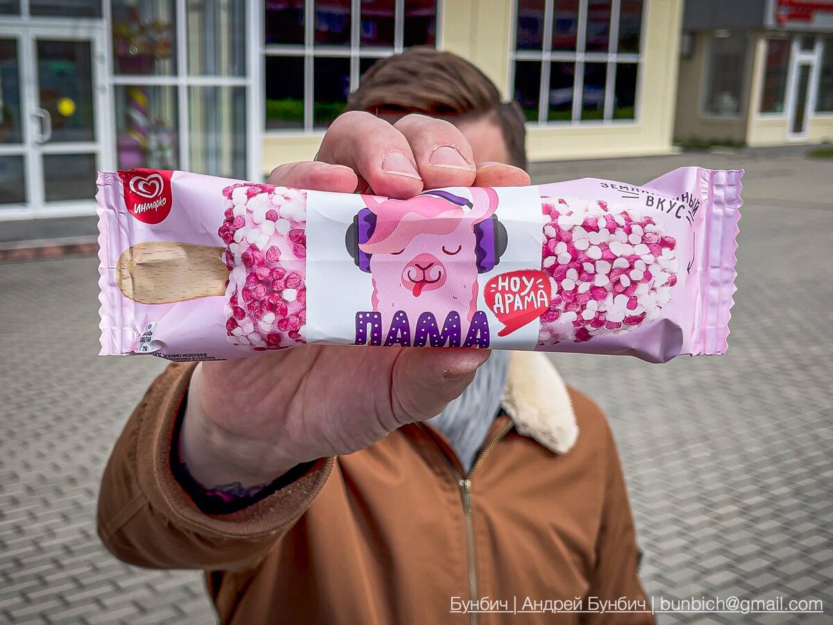 Когда я покупал это мороженое, то совершенно не представлял, сколько оно стоит, так как не смог найти ценника на витрине. Я решил, что раз цена не известна, то это хороший повод сделать обзор, не опираясь на стоимость. Сколько оно стоит, я, конечно, все равно расскажу, но уже в конце статьи. Меня это мороженое зацепило прежде всего своей яркой упаковкой, которая состоит из обычного пластика. Называется мороженое “ЛАМА, ноу драма”. Из названия сразу понятно, что оно ориентировано в первую очередь на молодую аудиторию. У меня мороженое было с земляничным вкусом, возможно, существуют и другие, но в магазине я нашёл только такое. Меня упаковка интересует в основном из-за того, что на ней должен быть состав. Состав длинный, что в целом ожидаемо, так как это многокомпонентное мороженое. Меня в составе ничего не смущает, но хочу предупредить, что тут есть пальмоядровые масла в составе глазури. Я к этому отношусь спокойно, но знаю, что многие такое не любят, поэтому сообщаю. Забавный момент, ч