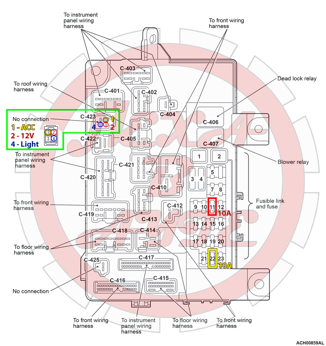 - Пин №1 (ACC) - с предохранителем №22 (10А), который отвечает за сервоприводы регулировки боковых зеркал заднего вида (то есть цепь достаточно мощная)
