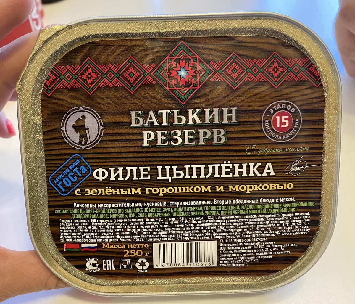 Сегодня у нас на тесте баночка консервов от бренда "Батькин резерв" - "Филе цыпленка с зеленым горошком и морковью". Сразу хочется отметить что консерва дорогая - за 250 граммовую баночку в "Ленте" просят 215 рублей. Видимо, такая цена должна означать высокое качество. Качество еще подчеркивает белорусская стилистика оформления банки, а также само название "Батькин резерв". Видимо, в честь Михаила Григорьевича. Все эти уловки явно неспроста, ведь в России белорусские товары считаются качественными. Изучив упаковку подробней, понимаем, что белорусскость тут лишь отчасти. Головной офис бренда находится в Химках, а в Белоруссии находится один из 2-х консервных заводов. К слову, данный экземпляр изготовлен в России, в г. Стара Русса Новгородской области. Состав включает филе цыплят-бройлеров (не менее 35%), вода питьевая, горошек зеленый, масло подсолнечное рафинированное, морковь, лук, соль, зелень укропа, перец черный молотый, лавровый лист. Прочитав с банки что "качество выше ГОСТа", "