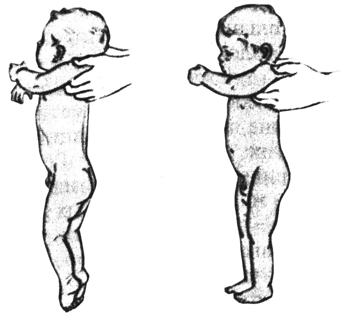 РЕФЛЕКС ОПОРЫ И АВТОМАТИЧЕСКОЙ ХОДЬБЫ. Этот рефлекс подготавливает малыша к ходьбе. Если взять малыша за подмышки, поддерживая головку, то новорожденный сгибает ножки во всех суставах. А если малыша опустить ножками на пол или твёрдую горизонтальную поверхность, то он будет стоять, опираясь полной стопой, а если наклонить вперед — начнет «переступать ножками», имитируя ходьбу. Рефлекс сохраняется до году.