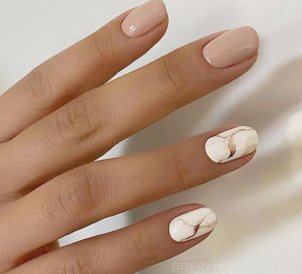 Нейтральный маникюр - лучший вариант, который подойдет к любому предмету гардероба в любом стиле. При нюдовом покрытии ваши руки станут ухоженными и женственными. А вдохновиться можно примерами ниже! Золотой мрамор Золото из моды уж точно никогда из моды не выйдет. К тому же, оно хорошо разбавляет монотонный бежевый цвет. Так что для разнообразия можно добавить мраморный принт на несколько пальцев. Нежное сиреневое омбре Сиреневый цвет говорит о нежности и женственности обладательницы. Если хотите сделать свое настроение весенним, то смело обращайтесь к сиреневому покрытию. Подписывайтесь на наш канал, если считаете, что быть можно дельным человеком и думать о красе ногтей! Листья в нежном маникюре Стемпинг - идеальный вариант для многих девушек. Поэтому белое покрытие можно украсить листьями, которые подойдут для романтичной натуры. Нежный колорблок Небесно-голубой прекрасно сочетается с пастельными оттенками, делая общий дизайн изящным и стильным. А чтобы сделать покрытие еще интере